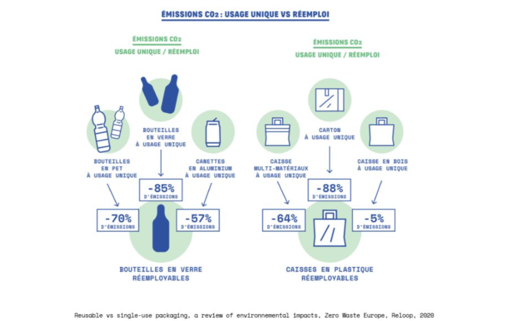 Grâce à la consigne des emballages, ceux-ci ont une seconde vie, sont nettoyés et réutilisés, et vous pouvez comparer facilement leur impact environnemental avec celui des emballages jetables.